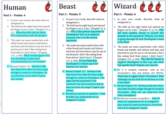 As you can see, there are three categories (my terms, but feel free to create your own); each category is slightly different based on the number of chilis. My students were reading a book, Trash by Andy Mulligan. In response to the first chapter, I wanted to review what they knew and could remember from the task.