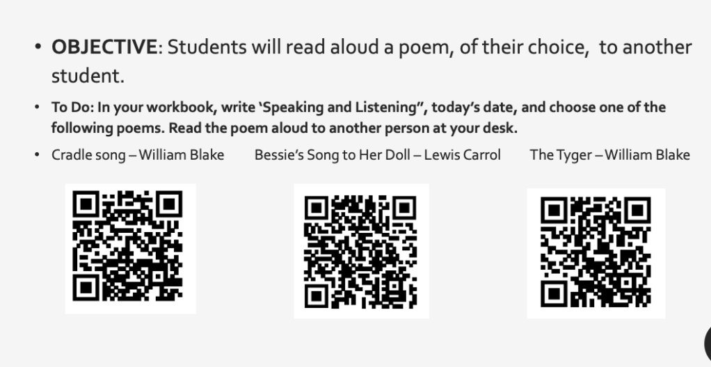 Students use their iPad or phone to connect to the QR code. Simply open the camera app and wave it over the QR code. This will send you to a link of the poem.