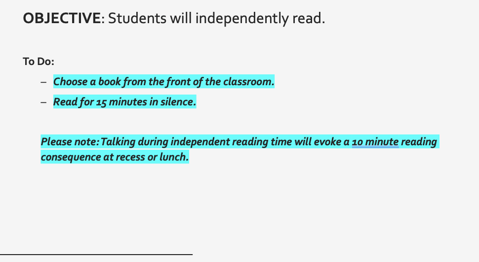 Note: Place restrictions around respect and quiet time. Silent reading is just that: silent. Students should not be speaking during this time to read. A quick glance across the room will quickly identify students who are not reading and you can put in your consequences.