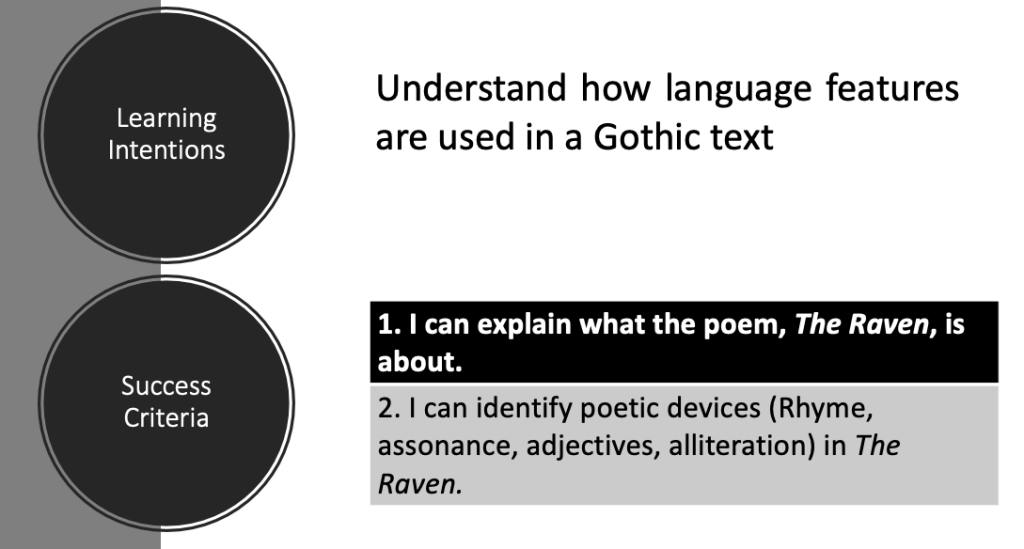 The overall learning focused on language features in a gothic narrative. To achieve this learning, I had students look at The Raven. Now, you wouldn’t have to look at The Raven to achieve this goal – you could look at any number of gothic narrative or poems. This is the sweet spot of the success criteria and learning intention. The end goal is always the same, but you are free to adjust the road leading there. For example, we could look at poetic devices in a different poem and still achieve the learning goal.