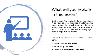 Next, you will want to outline the narrative of the lesson. What will students explore. There are many parts to teaching The Raven and outlining the steps is helpful for students to understanding of the where the learning is going.
