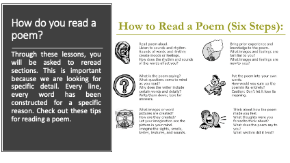 Next, you want to introduce the poetic devices. Now, the reason I don’t introduce this at the beginning of the lesson is to avoid information overload. Steadily introducing topics and information to students is information. Throwing them everything at one will only overload them.