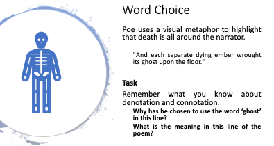 In this section, students begin inferring information from the text. Provide the following extract from the larger extract to analyse. By this point, they have the skill set to analyse the word choice and explore what Poe is discussing in the line.