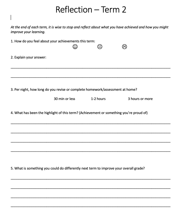 At the end of each semester or term, you will likely want to encourage your students to reflect on their learning. This is a healthy tool for improvement. Students need to be able to connect their effort with their achievement. For example, if they are recognising that they are not improving in a subject, though they are not completing any study at home, there will be an obvious disparity and little chance for growth.