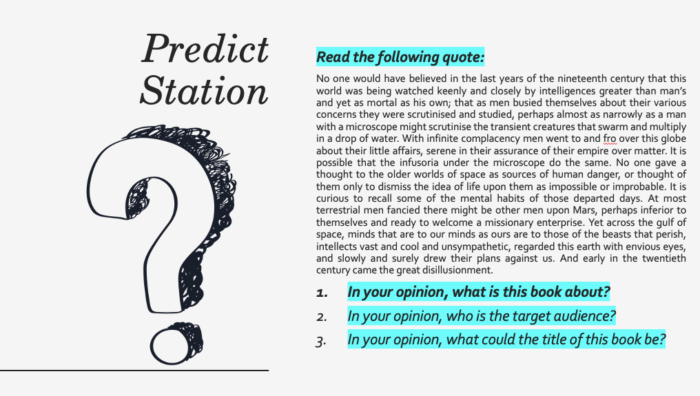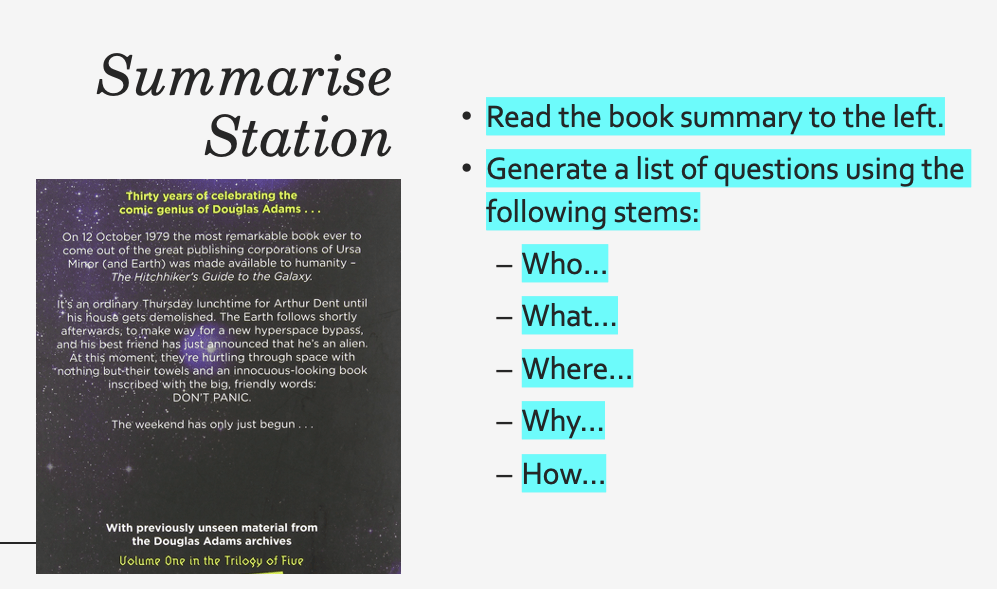 In the Summarise Station, students summarise the WWWWH of the blurb. Again, this is quite similar to the prediction station and allows students to become mentally prepared for the type of story they will encounter.