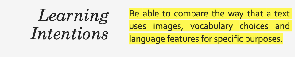 2. Next, you can present students with the learning intentions. Explain to students that they will be looking at how images, vocabulary choices and persuasive techniques are used construct a message in propaganda posters.