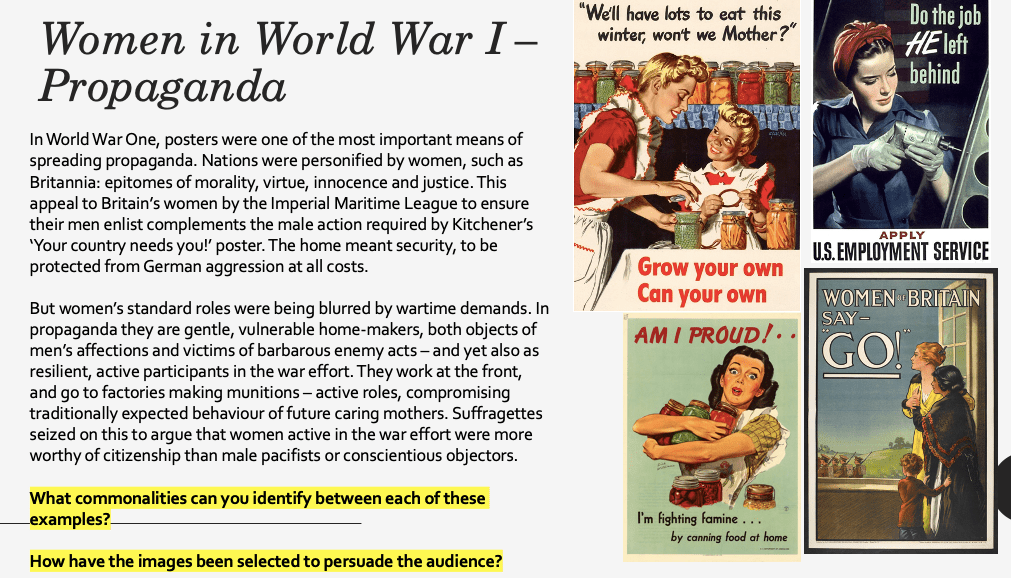 5. Now students are ready to analyse the different types of propaganda. I have chosen to explore how men and women were represented during World War One. Before students answer the questions in yellow, have them analyse the images and identify commonalities between: