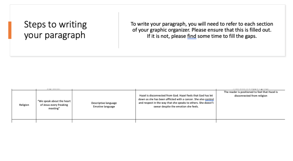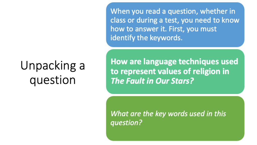 Prior to writing the paragraph, ask students to locate the keywords in the question you provide; I will use the following as an example: how are language techniques used to represent values of religion in The Fault In Our Stars.