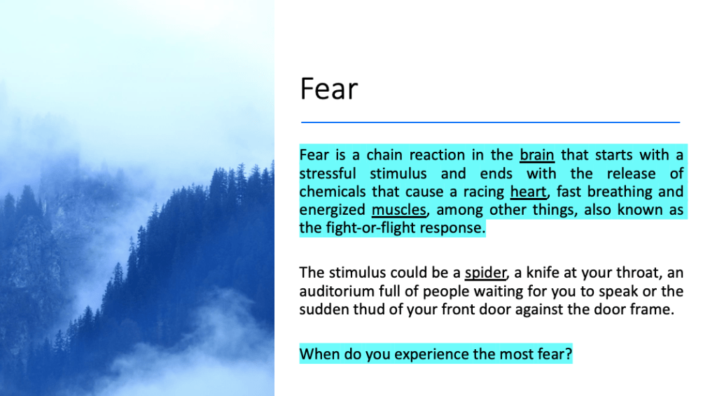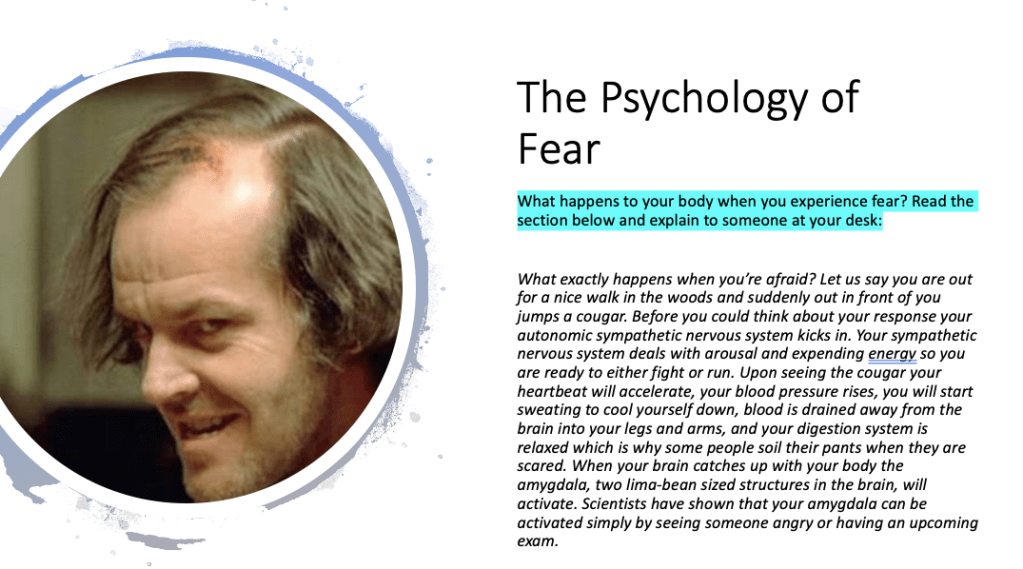 As a way of introducing the topic, discuss the notion of fear and how it affects the human body. Quiz students on what happens to them when they experience fear and record on the whiteboard.