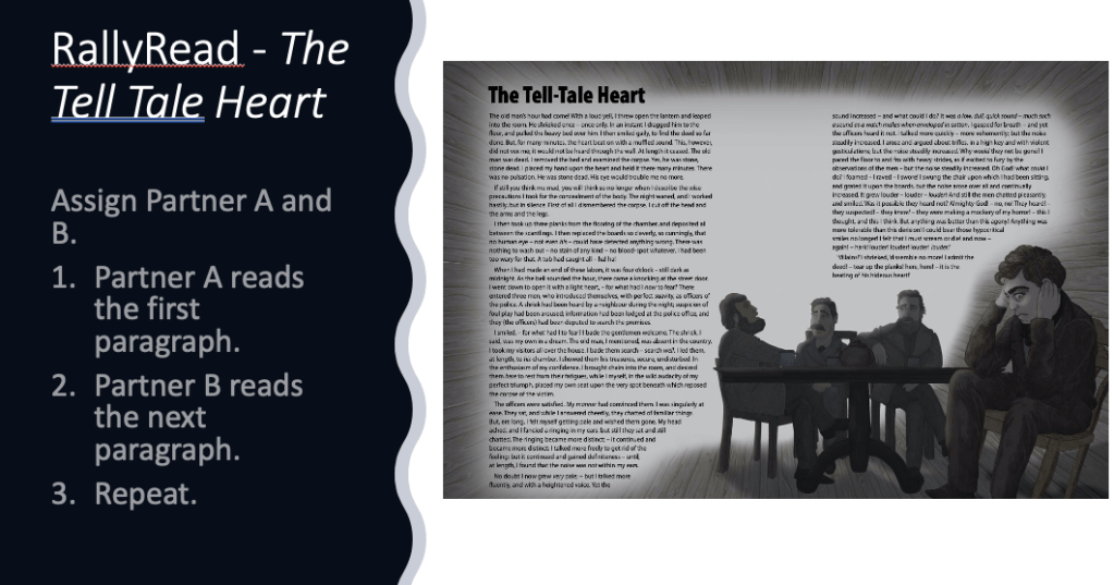 Prior to introducing students to the story, assign partner A and B. Partner A reads the first paragraph. Partner B reads the second. Ensure that students read the work aloud, that they are actively listening and taking turns. This is an excellent Kagan strategy to encourage engagement and reduce a heavy reading load on students.