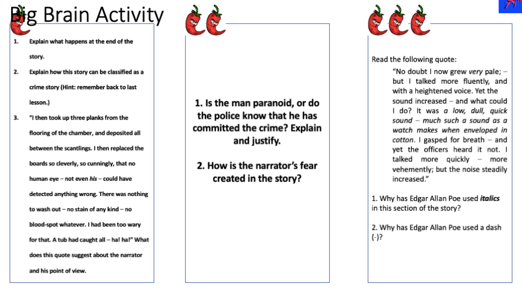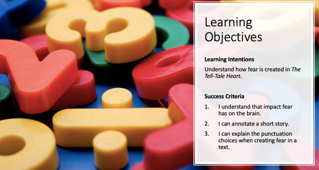 Introduce the learning intention to students. The focus here is understanding how fear is created in The Tell Tale Heart.