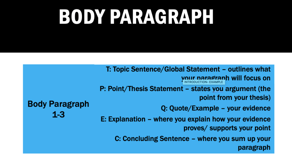 Once students have grasped the introduction, they are ready to approach the body paragraph. Here they will outline the argument of their response. A bulk of their evidence will be presented along with their analysis.