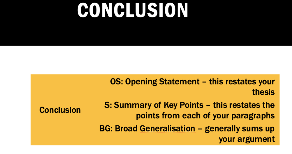 The conclusion, at this stage, should be the easiest part of the essay. It is, more or less, a recycled version of the introduction along with elements of the body paragraphs. Students should effectively restate the thesis statement, summarise the key points of the body paragraphs and offer a thoughtful statement that encourage the reader to think about the ideas in the film broadly in society. Check out my example below for an example of what this look like.