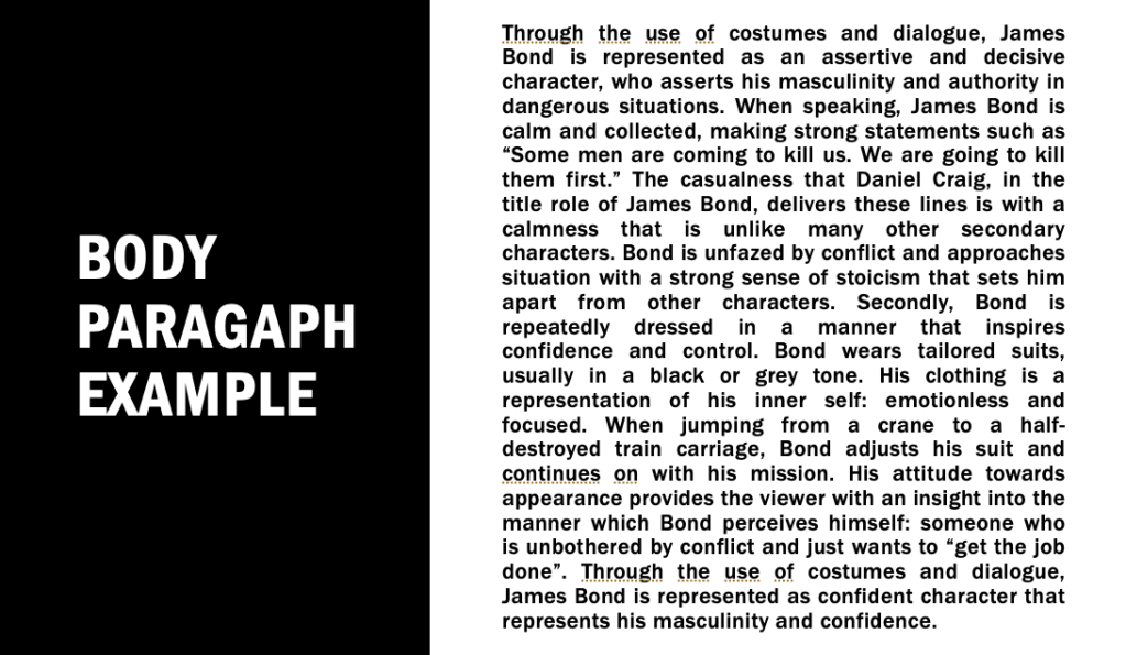 Below is an example of a body paragraph. It highlight the filmic conventions, as addressed in the question and how Bond is represented in the film.