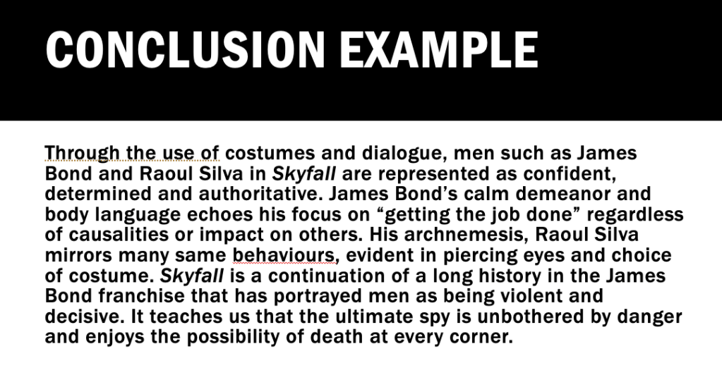 The thesis statement below, the first sentence, merely restates the one included in the introduction. Next, I have offered some key ideas from the essay and concluded with a final statement about some of the ‘takeaways’ that we can adopt from the film. I have chosen to focus on the representation of men as being synonymous with the ‘ultimate spy’ though other ideas about the negativity of these representations would also offer in-depth analysis.