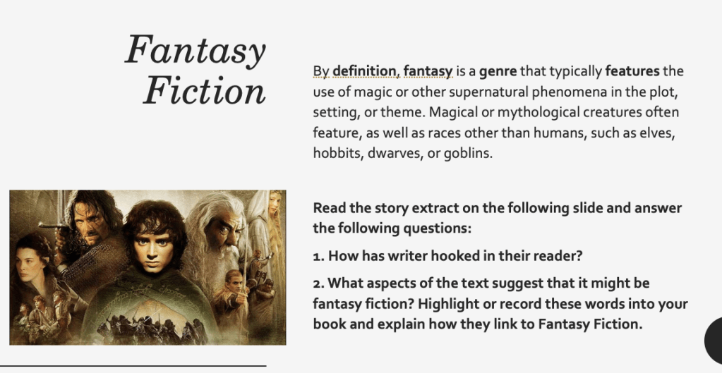 Start by presenting a definition of your chosen genre. The one below I have focused upon is fantasy fiction. First, present the definition to students and quiz them on the key terms. For example, “supernatural phenomena”, “mythological creatures” and “magical” might be a point of discussion. Talking about these key words will be important when connecting to conventions of the text.