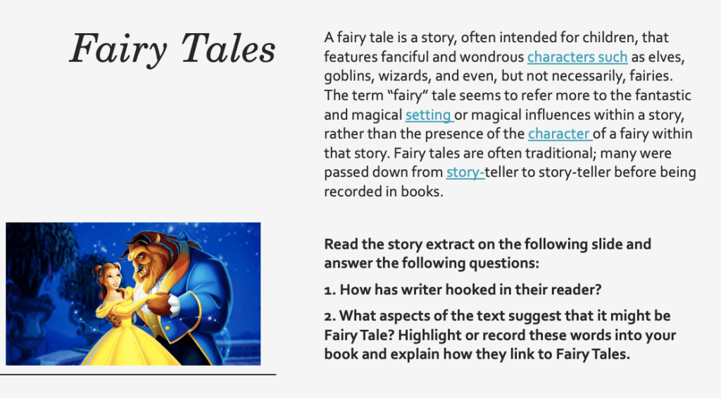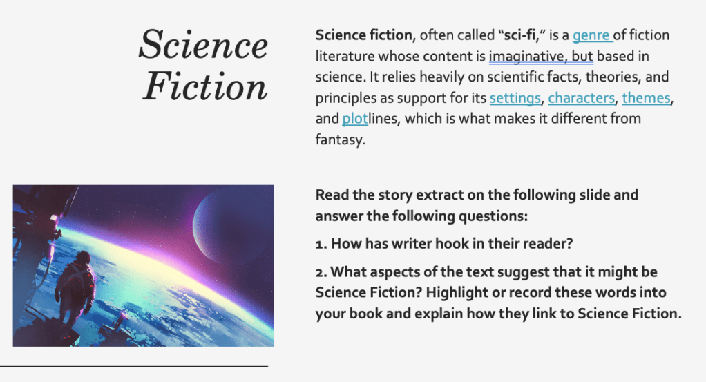 Once student have practised as a whole class on fantasy fiction, you might like to split them into groups and work on other genres. Below I have outlined Science Fiction and Fairy Tales.