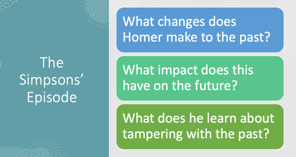 In the fifth annual Treehouse of Horror episode, The Simpsons explored the impact of time travel. A simple story: Homer must fix a toast and in doing so creates a time travelling device; he travels back to the Mesozoic Era and changes the avenues of history by killing a large prehistoric insect. Once the toast pops, we see Homer return to the past and explore the wide ranging damage he created.
