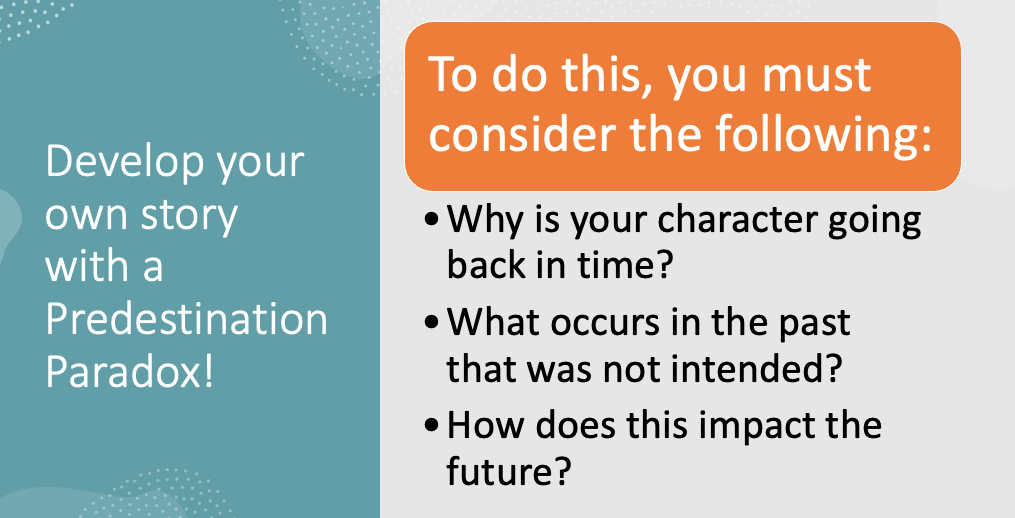 To thwart this old habit, we need to break the cycle and introduce them to a variety of narrative devices. One of these devices that I have been teaching recently is the predestination paradox. Essentially, predestination paradox boils down time travel; an individual travels back in time to change the past, but in doing so becomes a participants within these events.