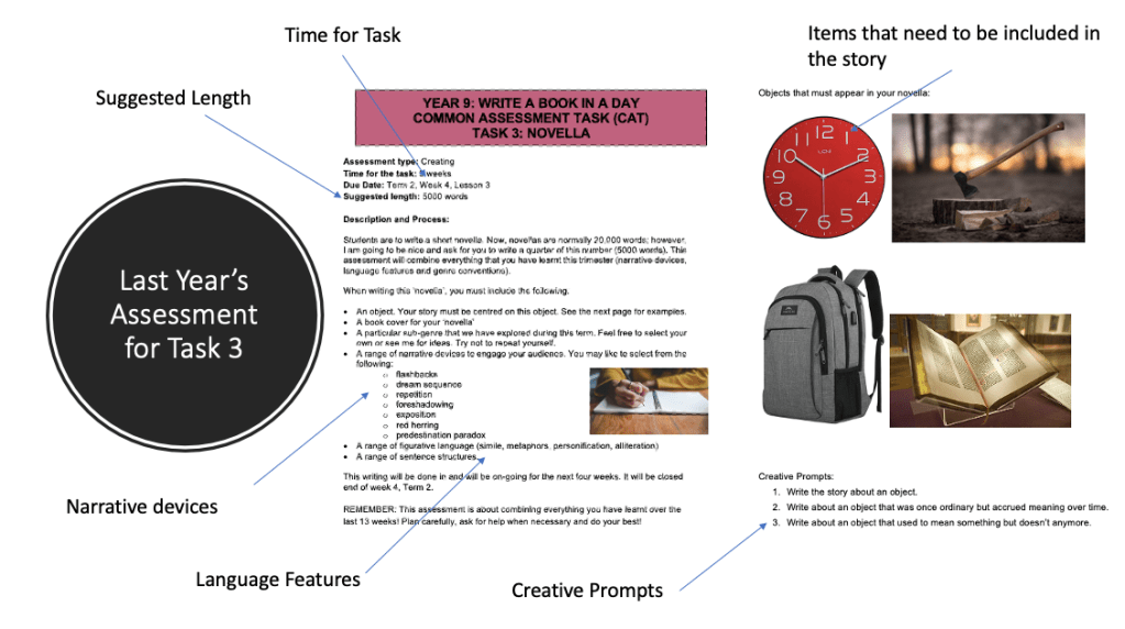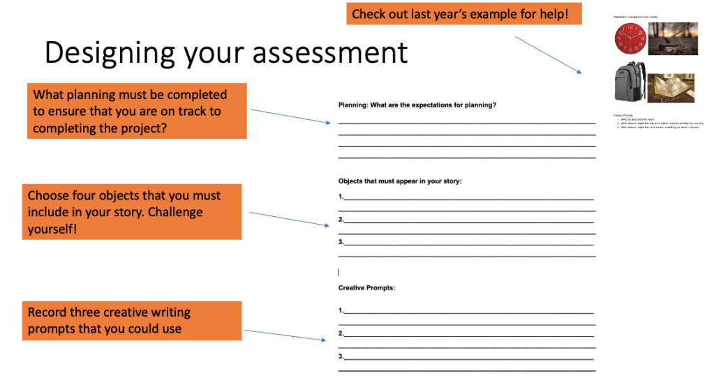 Firstly, I outlined what I had used last year and the types of elements they would need to include when creating their own assessment. They had to include generic components like the time allocated to complete, suggested length, items included in story, narrative devices and language features.