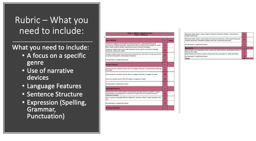 Questions came about during the instruction: What is the word limit? Can I write 100 words? Sure, if you can meet the expectations of the rubric! Every response came back to: does it meet the requirements of the rubric? Is using one narrative device or language feature enough to achieve a high mark? Check the marking rubric.