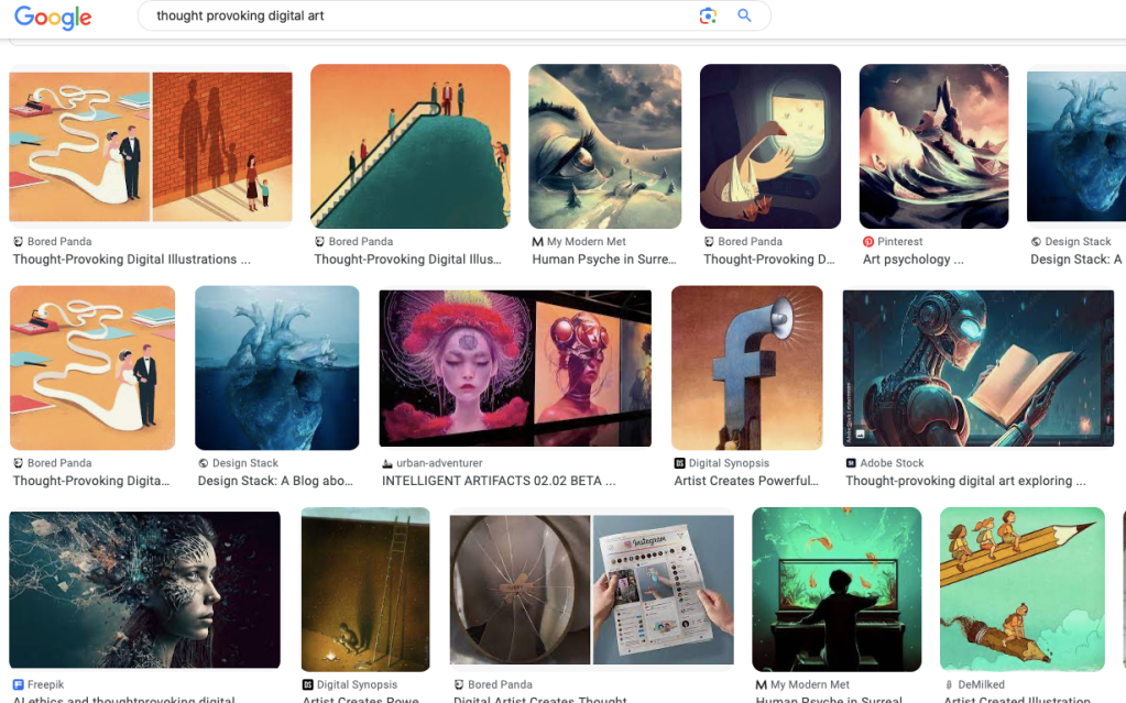 With the increase in digital art and AI generated imagery, you will not find it difficult to find images that engage the sense and provoke interesting discussions with you classroom. Simply typing “thought provoking digital art”.
