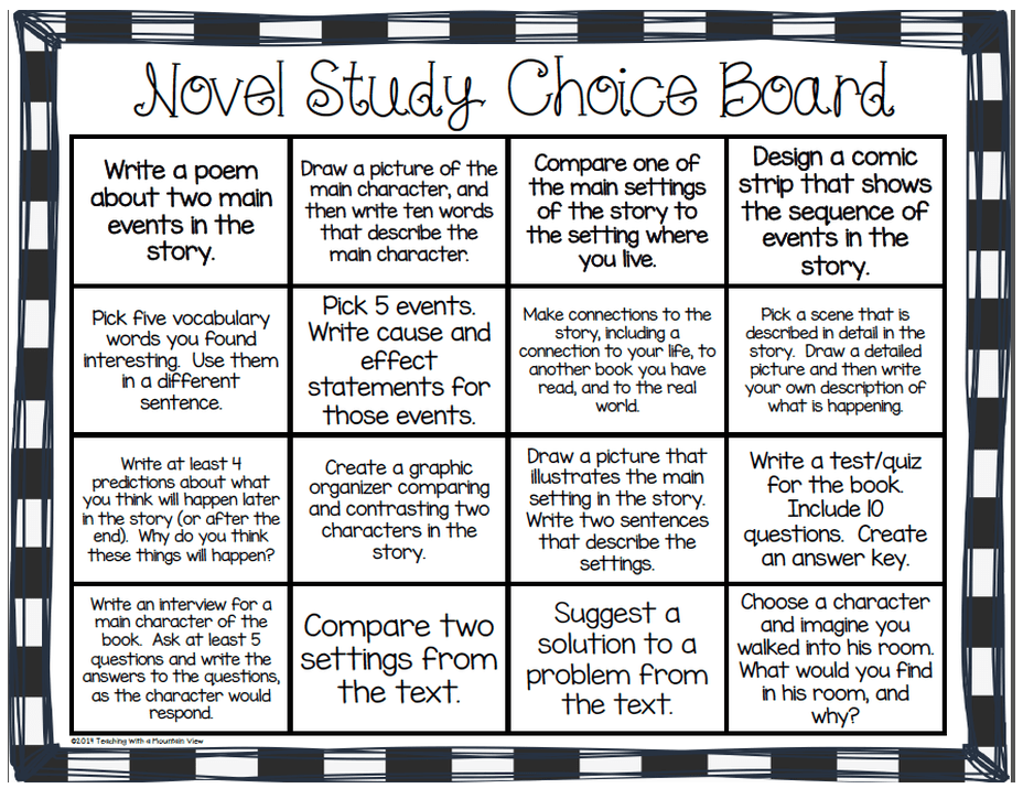Where possible, give students choice about how they complete work. This isn’t always applicable, but it is a healthy way to share to students that you care about their creative input. Tell them the end road and inform them that as long as they get their than the production of the work is up to them. For example, you might provide students with a choice board. Here is an example: